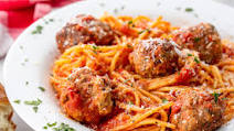 SPECIALTY: Tanya’s Sunday Dinner Special: Spicier tomato sauce with beef meatballs, hot Italian sausage, and pork pieces over pasta with salad of lettuce, tomato,  and cucumber with Italian Vinaigrette Dressing and Extreme Garlic Bread