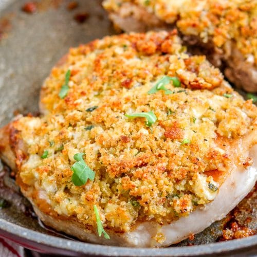 PORK: Blue Cheese Crusted Pork Chops with Herbed Roasted Potatoes & Roasted Brussel Sprouts